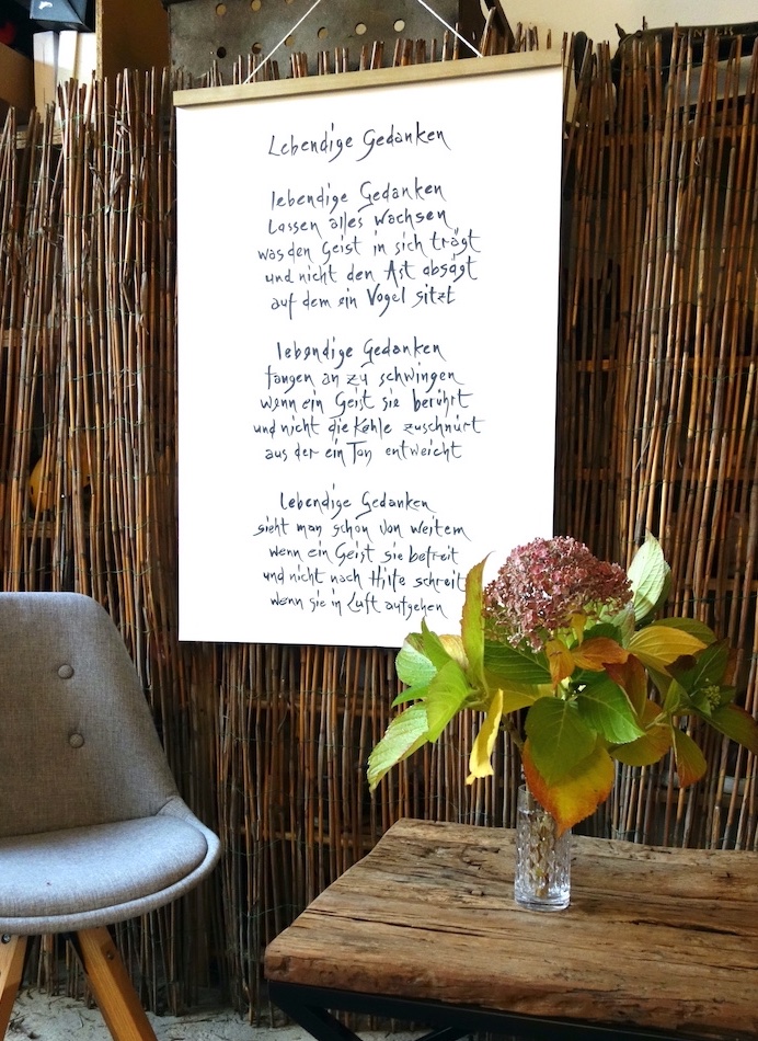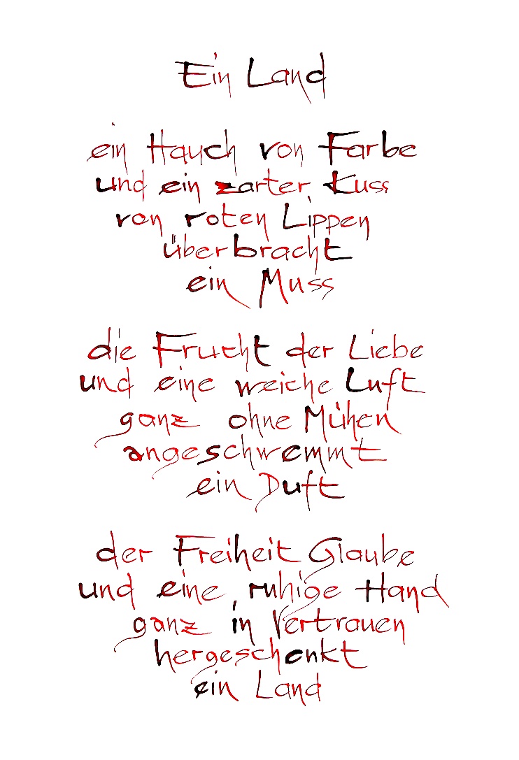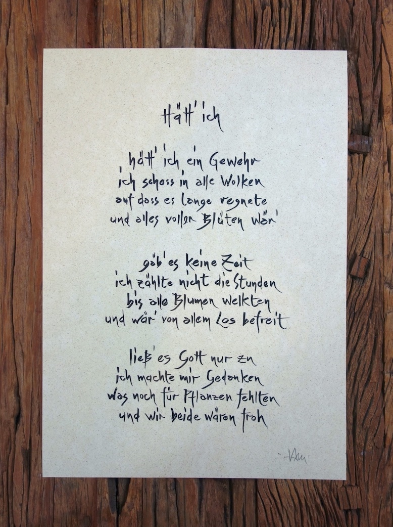 Meine Mission ist es, Lyrik wieder an die Wände zu bringen. Dort wo sie gesehen wird - so wie Fotos und Gemälde. Ich verwandle meine Gedichte in Kalligrafien, die das Auge anziehen sollen, ohne dass der Geist weiß, warum.